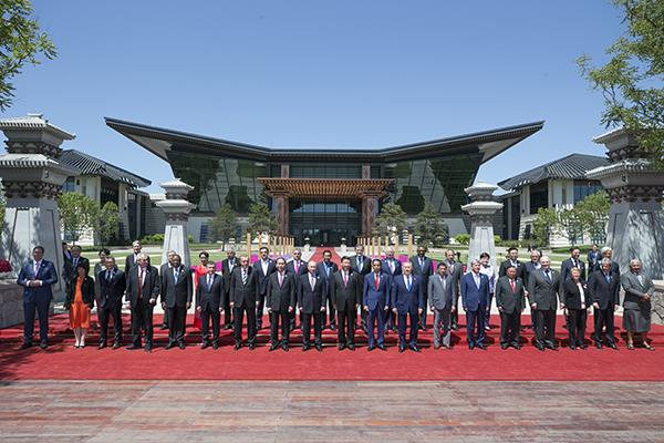 5月15日,“一帶一路”國際合作高峰論壇在北京雁棲湖國際會(huì)議中心舉行圓桌峰會(huì),國家主席習(xí)近平主持會(huì)議并致辭。這是當(dāng)天中午,習(xí)近平同與會(huì)領(lǐng)導(dǎo)人和國際組織負(fù)責(zé)人以國際會(huì)議中心“漢唐飛揚(yáng)”主建筑為背景集體合影。(姚大偉 攝)