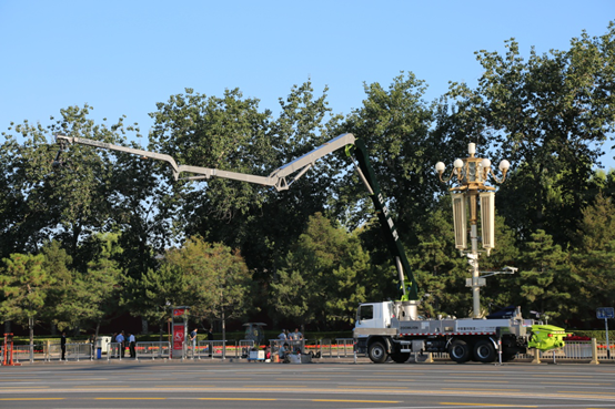 除了以上的起重機(jī)產(chǎn)品之外,再來(lái)看看中聯(lián)重科助力大閱兵的混凝土裝備。此次中聯(lián)重科派出的是型號(hào)為33X-4Z的33米混凝土泵車(chē),泵車(chē)的拍攝位置在天安門(mén)的西側(cè),長(zhǎng)安街的北面,大閱兵盛典時(shí),該泵車(chē)臂架正是充當(dāng)了搖臂的作用,支撐架設(shè)攝像機(jī)進(jìn)行現(xiàn)場(chǎng)拍攝,很多經(jīng)典的近景或特寫(xiě)鏡頭就是依靠這個(gè)長(zhǎng)臂架捕捉的。