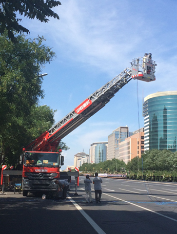 位于長(zhǎng)安街南側(cè),人民大會(huì)堂附近的是亞洲目前**高的云梯消防車(chē),型號(hào)為YT60的中聯(lián)重科60米云梯消防車(chē)。它主要承擔(dān)了兩項(xiàng)重要任務(wù),前期主要配合QY80起重機(jī)進(jìn)行“天鷹座”的牽線工作;而在慶典當(dāng)天,央視工作人員在YT60撐起的工作斗里進(jìn)行現(xiàn)場(chǎng)拍攝,電視中許多天安門(mén)城樓上領(lǐng)導(dǎo)、嘉賓以及受閱部隊(duì)通過(guò)天安門(mén)前的正面鏡頭就是由它捕捉的。
