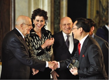 ▲意大利前總統(tǒng)納波利塔諾為中聯(lián)重科詹純新頒發(fā)“萊昂納多國際獎”