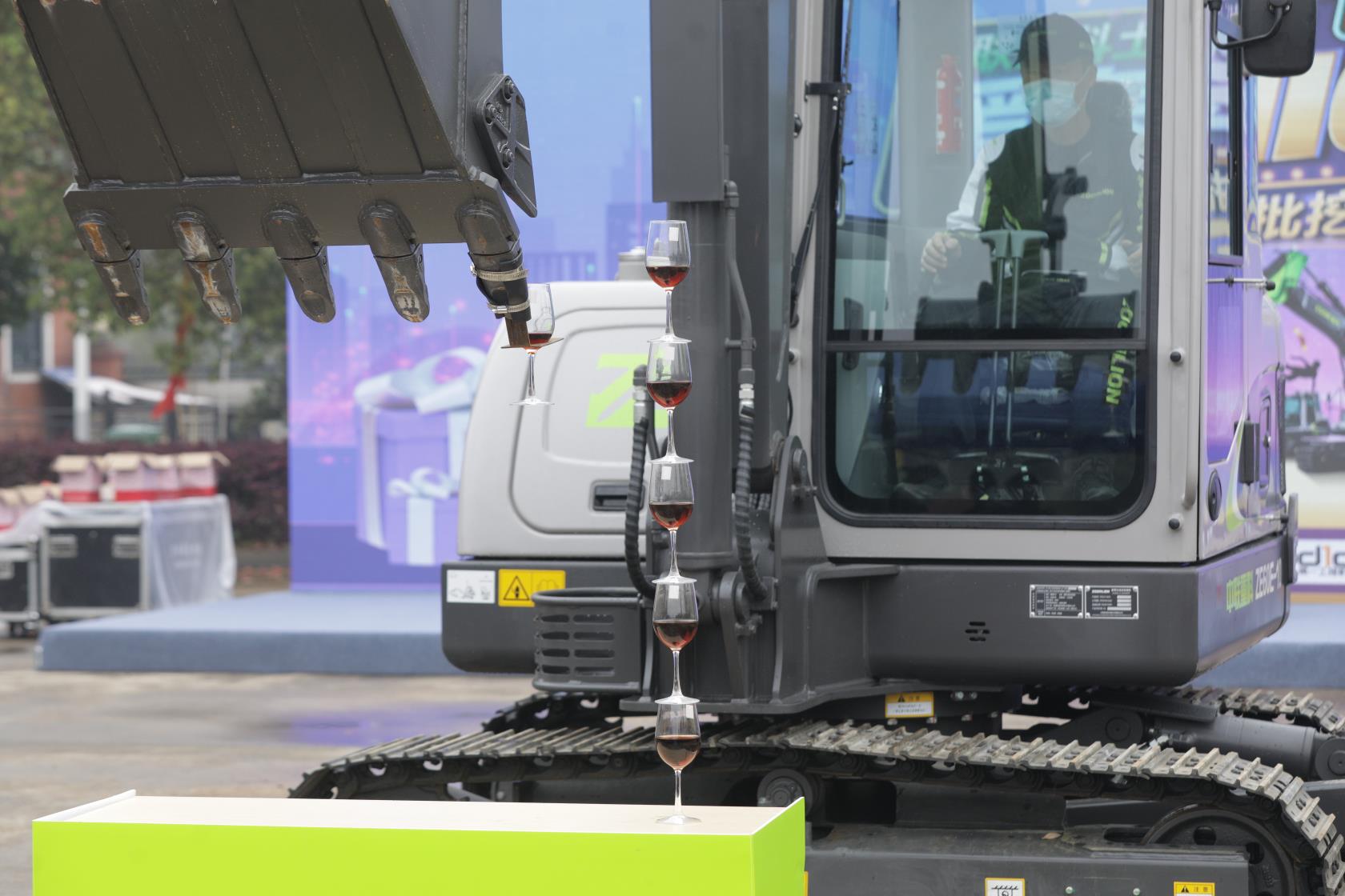 直播現(xiàn)場,中聯(lián)重科ZE60E-10挖掘機(jī)表演了連人手都很難操作的“疊酒杯”高難度動作。只見機(jī)手輕松用鏟斗斗齒將裝滿紅酒的酒杯成功疊加在一起,里面的紅酒沒有一點傾灑,完美的“人機(jī)合一”讓人驚嘆。