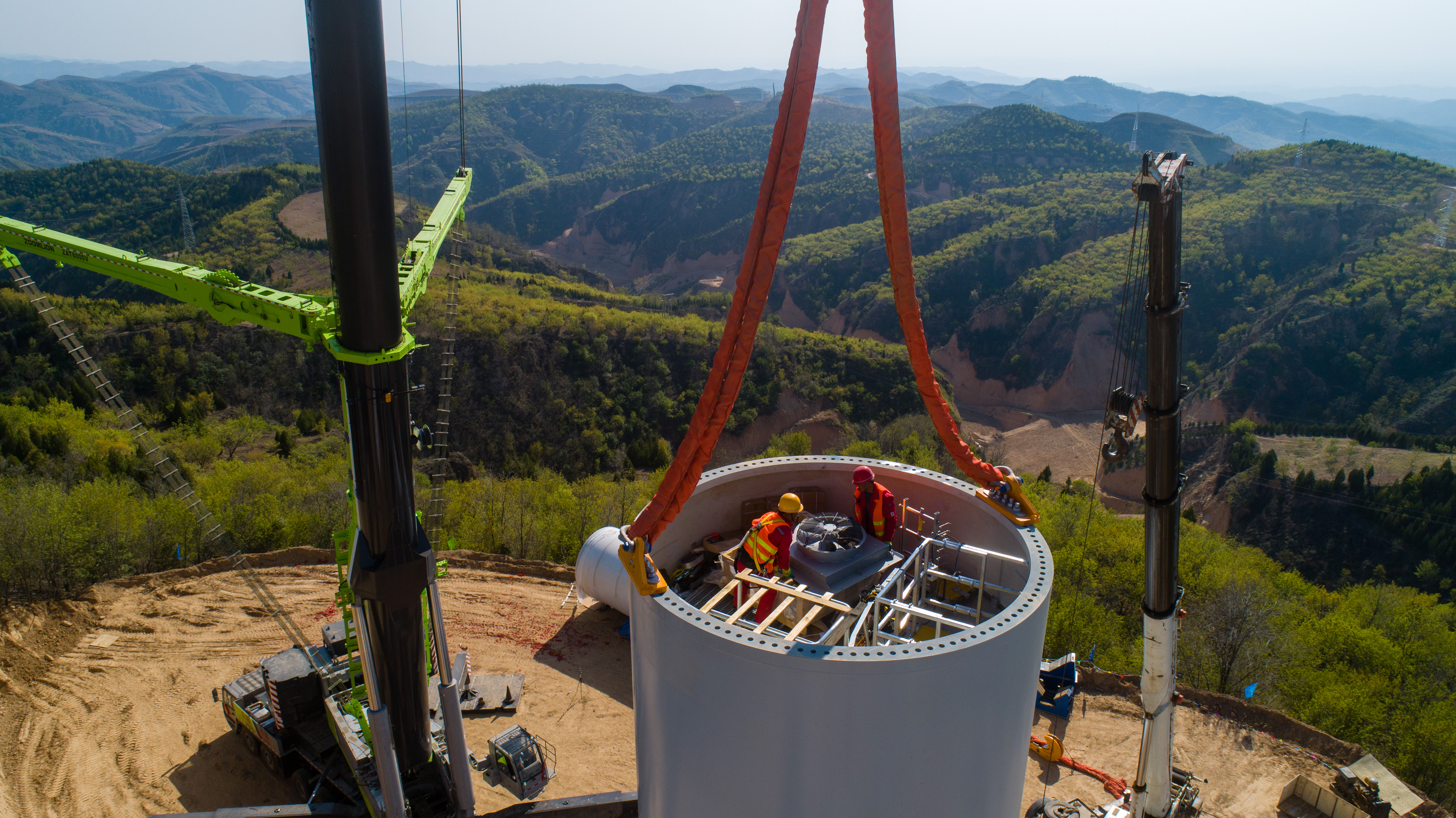 ? ?4月28日,隨著**后一根數(shù)十米長的風(fēng)機(jī)葉片徐徐上升,在近百米的高空與輪轂精準(zhǔn)對接,山西省石樓縣小蒜鎮(zhèn)風(fēng)電建設(shè)項(xiàng)目又完成了一臺風(fēng)機(jī)吊裝。湛藍(lán)的天空下,中聯(lián)重科極光綠起重機(jī)臂架高聳挺立于山頂,展開的超起機(jī)構(gòu)如同張開雙翅,蔚為壯觀。中聯(lián)重科800噸全地面起重機(jī)用卓越的性能和高效的施工不斷地續(xù)寫著“風(fēng)電神器”的佳話。