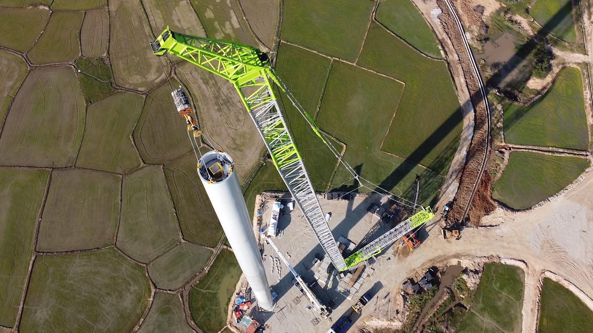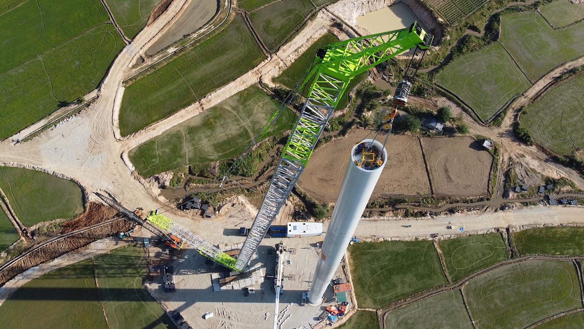 近日,在“一帶一路”沿線國(guó)家越南的某風(fēng)電機(jī)組安裝現(xiàn)場(chǎng),一臺(tái)中聯(lián)重科極光綠履帶式起重機(jī)巍峨挺拔地矗立在這南國(guó)田園里緊鑼密鼓地進(jìn)行吊裝工作。