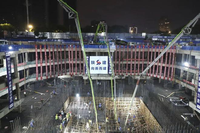 該項目基坑深度近20米,筏板**厚處為7.55米,整個基礎底板澆筑工程采用多點同時澆筑,從中心向四周,由深到淺,斜面分層施工,整體一次完成澆筑。為應對跨晝夜深基坑連續(xù)作業(yè),項目方經(jīng)過多方對比,**終選擇中聯(lián)重科設備承擔重任。