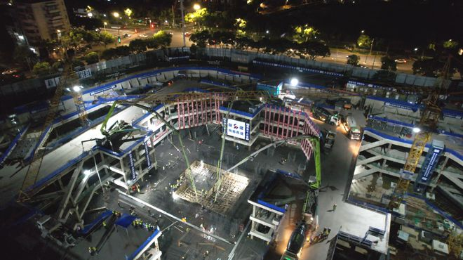 7月31日20時,這場澆筑“車輪戰(zhàn)”正式拉開帷幕。中聯(lián)重科56米、63米及數(shù)臺“凌云Ⅱ”62米泵車,以及三臺22MPa車載泵進駐施工一線,面對高溫條件下大體積混凝土澆筑、超70小時深基坑不間斷施工、地下空間狹小等諸多難題,3臺泵車和3臺車載泵同時作業(yè),憑借出色的穩(wěn)定性和可靠性大顯身手,澆筑沖刺階段峰值達260m3/小時。8月3日20時,“小綠奇跡軍團”不負期待,順利完成**后一方混凝土澆筑。