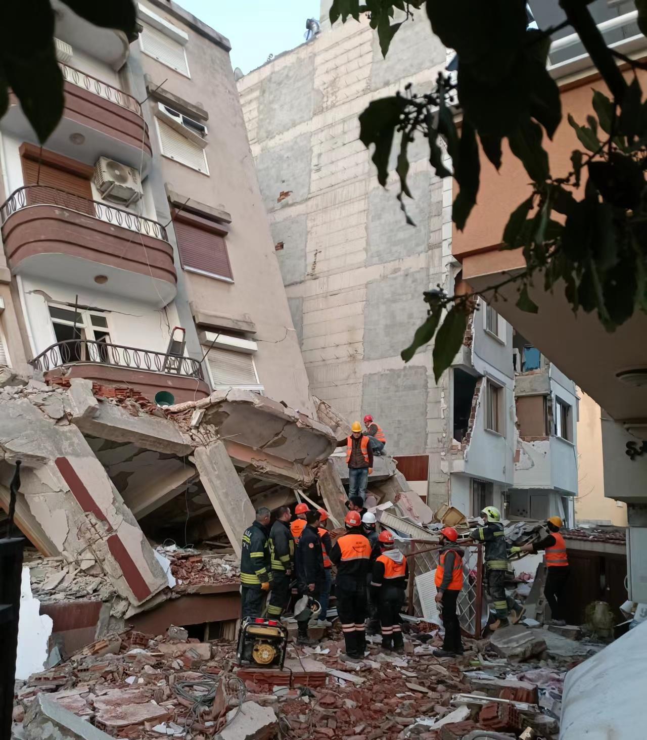 哈塔伊省是此次土耳其地震的重災(zāi)區(qū)之一。9日下午,救援人員在當(dāng)?shù)匾惶帍U墟中發(fā)現(xiàn)了一位老人,坍塌的樓板壓在身上讓她無(wú)法動(dòng)彈,嘴里不斷發(fā)出呼喊,但聲音卻越來(lái)越微弱。正在附近搜救的中聯(lián)重科救援隊(duì)立即趕到現(xiàn)場(chǎng),查看后發(fā)現(xiàn)廢墟是一棟7層樓房坍塌后形成的,整棟樓因地基損壞,整體已向后傾倒,傾斜角度已超30度。老人被困在二樓,救援面臨重重困難。