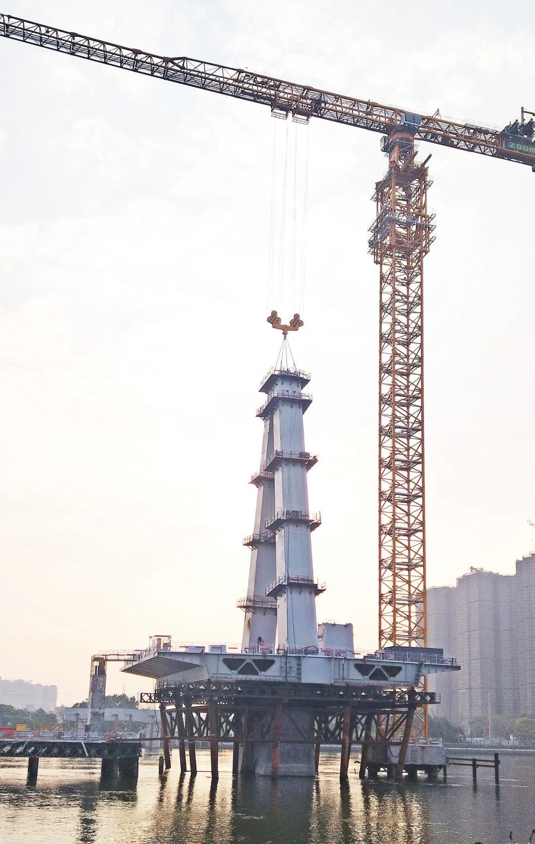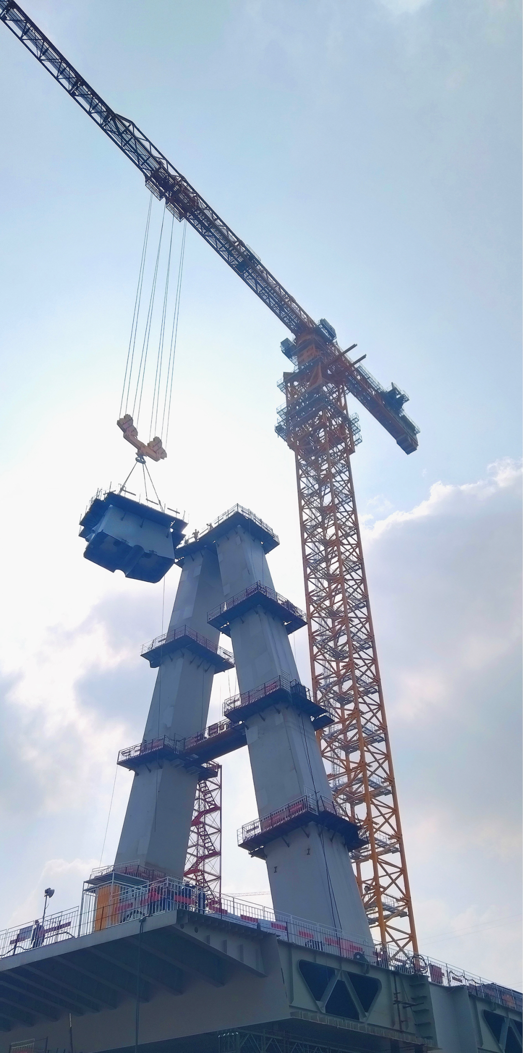 為提升建設(shè)速度、盡量減少施工影響,項(xiàng)目方采取裝配式施工,先制作好大量預(yù)制構(gòu)件,再拉到現(xiàn)場(chǎng)的設(shè)計(jì)位置進(jìn)行拼裝,以“搭積木”的方式建橋。由于建設(shè)過(guò)程涉及水上作業(yè)、大件吊裝等重大方案,還具有制作安裝精度要求高、重型吊裝作業(yè)量大、協(xié)調(diào)工作接口多等特點(diǎn),為保證預(yù)制結(jié)構(gòu)順利起吊安裝,項(xiàng)目方、租賃公司攜手中聯(lián)重科,量身定做了超大型塔機(jī)R4300-200。
