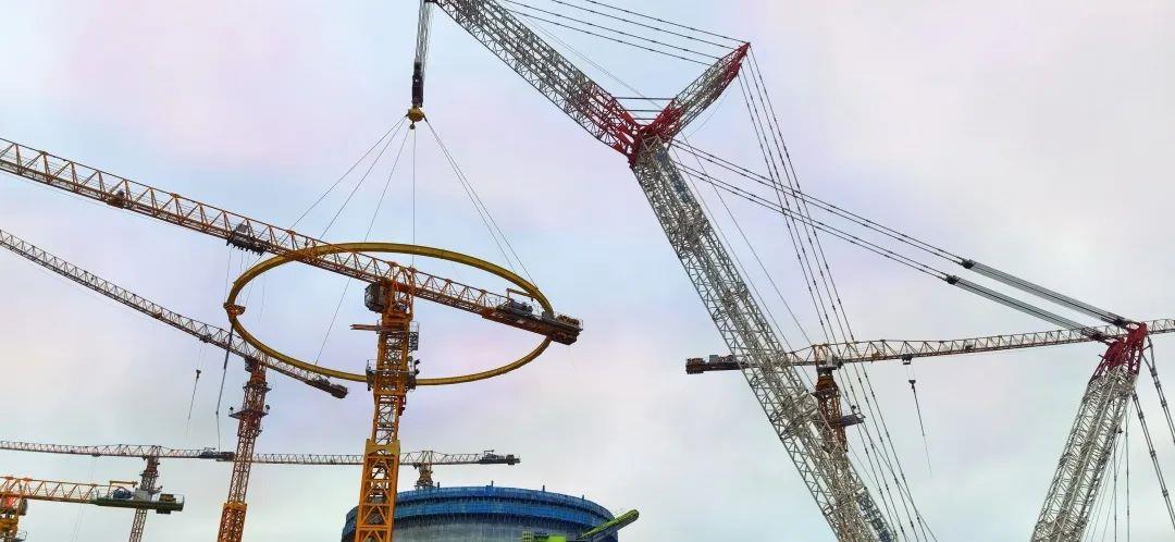 ▲中聯(lián)重科起重機(jī)正在進(jìn)行昌江核電4號機(jī)組環(huán)吊橋架整體吊裝(圖片源于“華能昌江核電”公眾號)