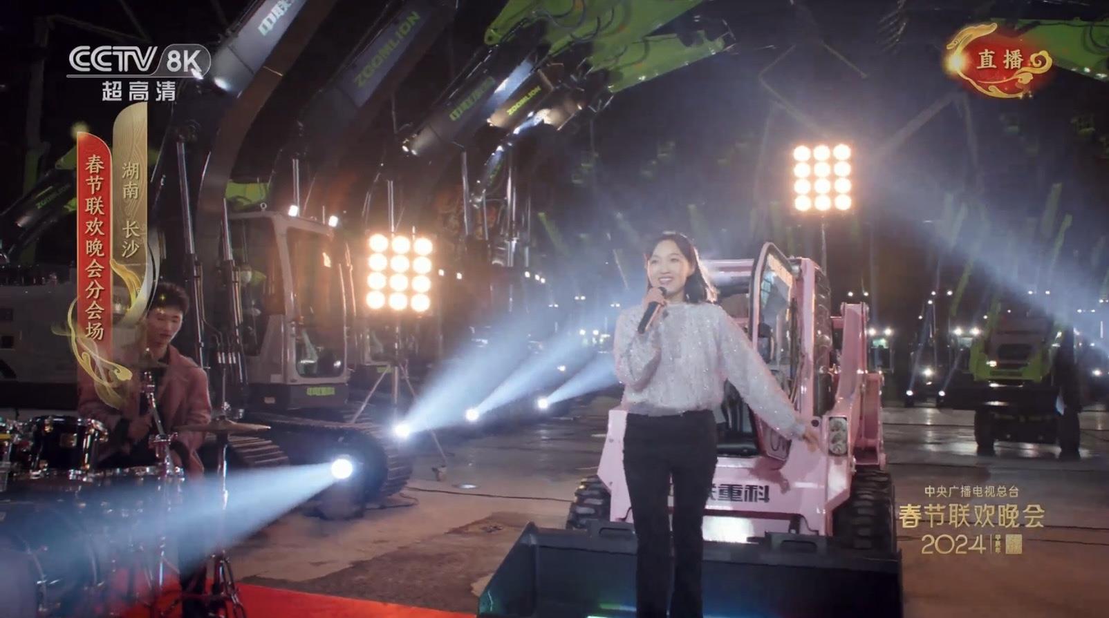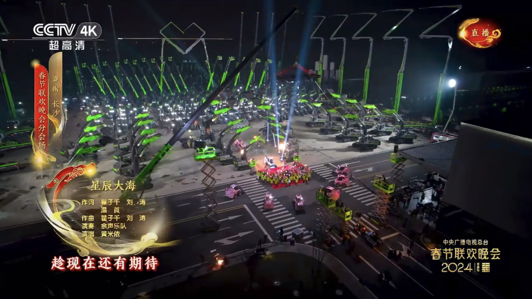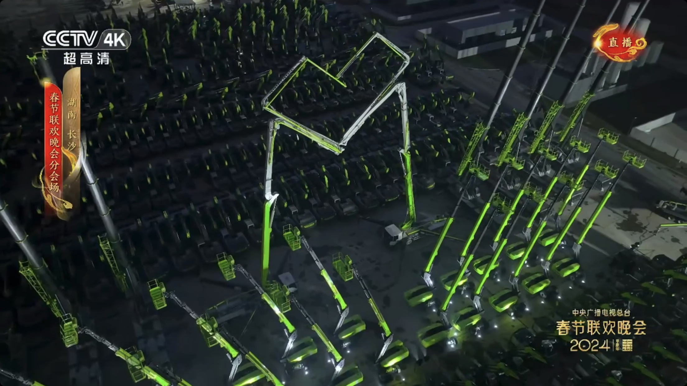 當(dāng)春晚的鏡頭來(lái)到中聯(lián)智慧產(chǎn)業(yè)城土方機(jī)械園,熒屏上頓時(shí)溢滿了科技感和機(jī)械感:中聯(lián)重科數(shù)十臺(tái)泵車、起重機(jī)展臂傲立舞臺(tái)后方兩側(cè),兩臺(tái)泵車在30米的高空用臂架組成一個(gè)巨大愛心,兩百多臺(tái)挖掘機(jī)依次排開,數(shù)十臺(tái)高空作業(yè)平臺(tái)舉臂林立,極為壯觀;舞臺(tái)上兩臺(tái)裝載機(jī)隨歌“伴舞”,一粉一綠活潑可愛。樂(lè)隊(duì)貝斯手、吉他手的“站臺(tái)”都是用的高空作業(yè)平臺(tái)。在“小綠軍團(tuán)”眾星拱月中,歌手黃米依從裝載機(jī)中走出來(lái),傾情演唱著《星辰大?!?。大國(guó)重器壯觀施工之美,中聯(lián)智慧產(chǎn)業(yè)城土方機(jī)械園燈塔工廠制造之美,以及歌舞演唱之美盡情展現(xiàn)。滿滿的“長(zhǎng)沙制造”元素,在熒屏上“龍”光煥發(fā)驚艷呈現(xiàn)。
