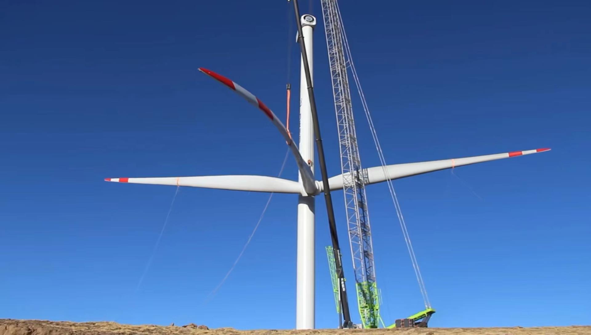 吊裝當(dāng)天,隨著總指揮一聲令下,一陣低沉而有力的轟鳴聲響起之后,首臺風(fēng)機的扇葉吊裝作業(yè)正式開始。吊裝設(shè)備緩緩上升,在中聯(lián)重科履帶式起重機和汽車吊順暢的動作下,巨大的風(fēng)機扇葉在空中劃過一道優(yōu)美的弧線,精準(zhǔn)地安裝在了塔筒頂部機艙上。