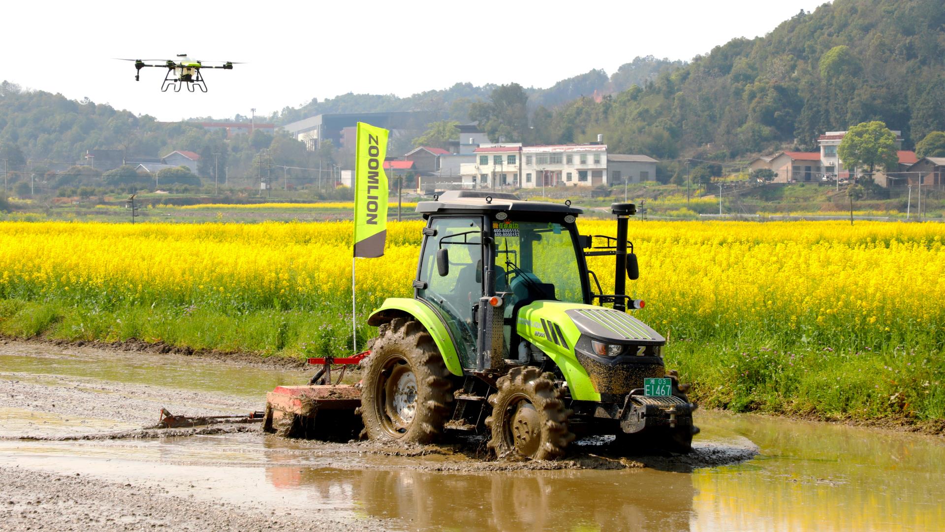 田地間,中聯(lián)重科水田拖拉機和履帶式旋耕機開足馬力開展耕整作業(yè),改善土壤結(jié)構(gòu)與肥力,為后續(xù)水稻種植做好準(zhǔn)備;搭載“中聯(lián)智駕”系統(tǒng)的水稻插秧機按照規(guī)劃線路自動行駛,在“北斗”定位技術(shù)的加持下,實現(xiàn)厘米級精準(zhǔn)插秧作業(yè),為水稻插秧環(huán)節(jié)提供更智慧的解決方案;中聯(lián)重科植保無人機騰空而起,靈活盤旋在農(nóng)田上空進行施肥作業(yè)?!案?、種、管”智慧無處不在,助力春耕提質(zhì)增效。