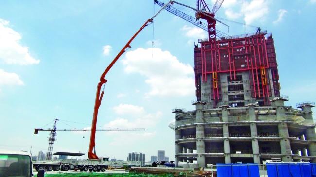 (中聯(lián)重科101米長(zhǎng)臂架泵車在武漢施工。)