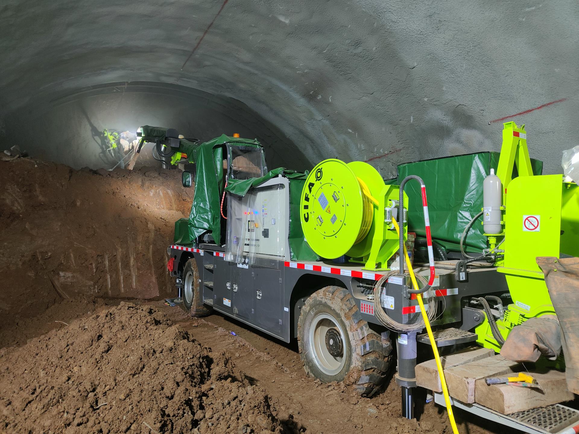 ▲中聯(lián)重科濕噴機(jī)正在項(xiàng)目現(xiàn)場(chǎng)進(jìn)行施工