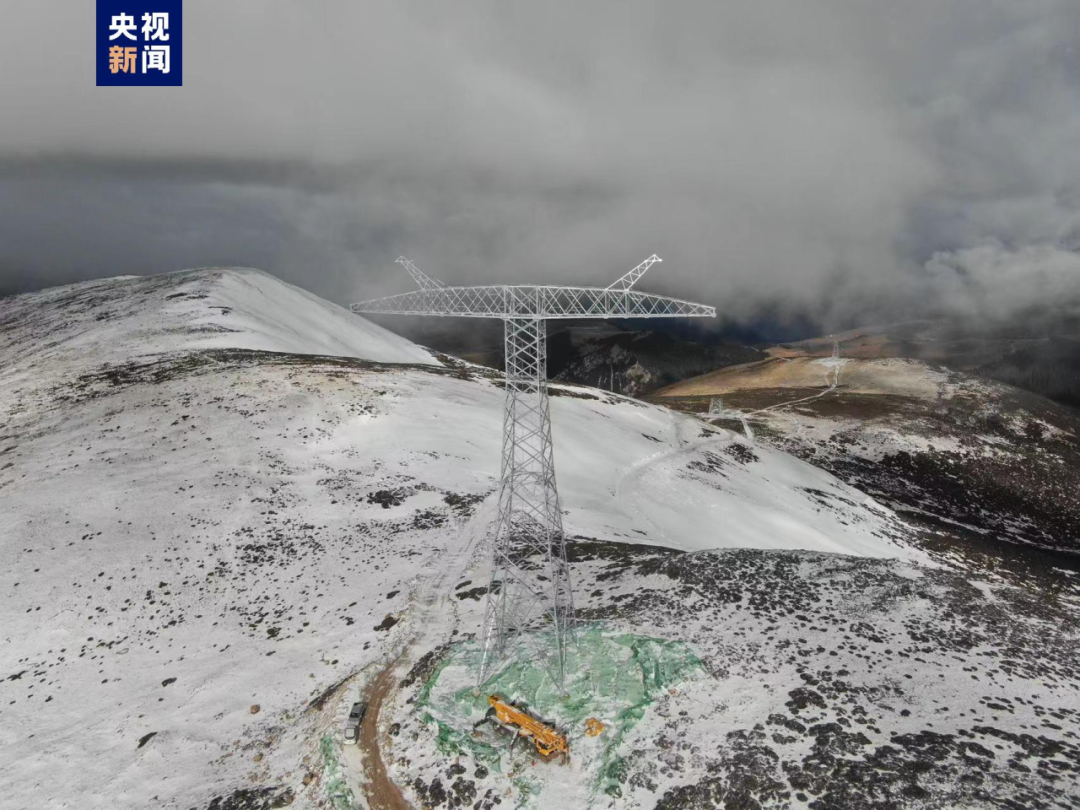 △四川省甘孜州巴塘縣德達(dá)鄉(xiāng)色烔瑪山上的金上—湖北特高壓工程鐵塔(圖片來源:央視新聞)
