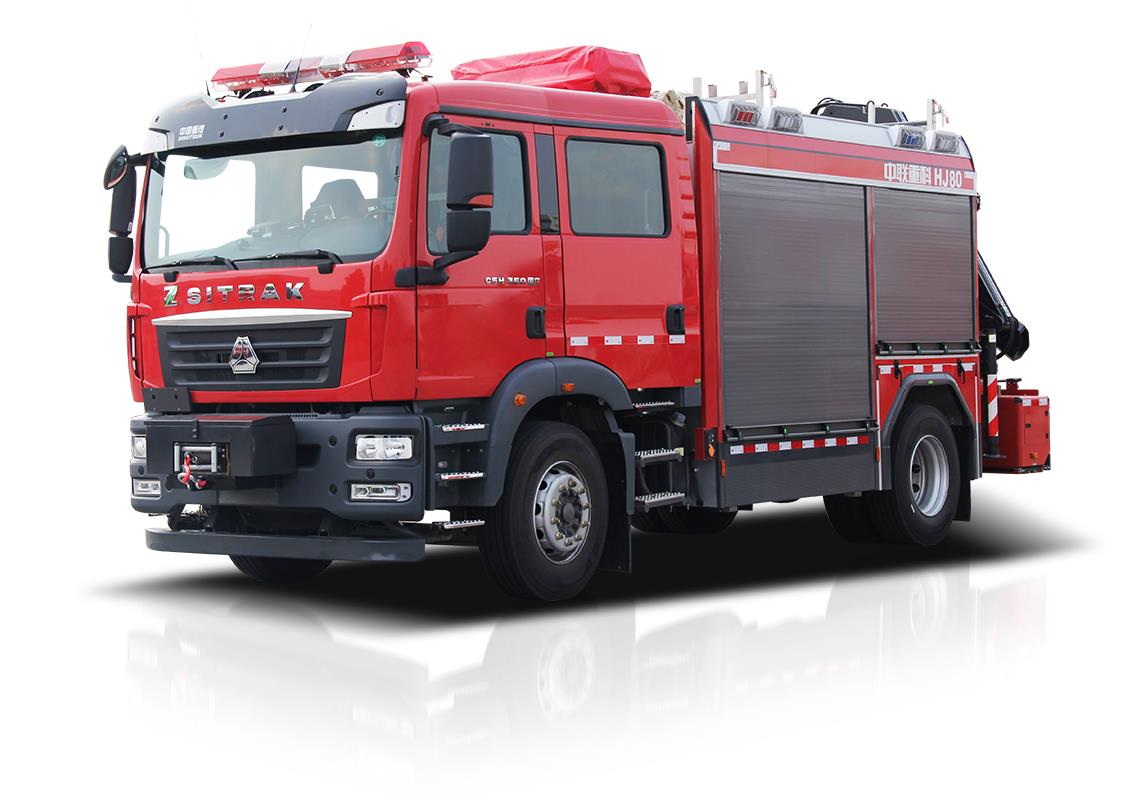 ? ? ? 中聯(lián)重科**三代HJ80型化學救援消防車,結合國內外消防車的先進理念和消防實戰(zhàn)創(chuàng)新設計而成,整車結構緊湊,越障能力強,可裝備化學洗消系統(tǒng)、絞盤、升降照明系統(tǒng)、起吊機、液壓破拆工具組、偵檢器具、救生器具等超過80件搶險救援器材,是集化學洗消、照明、供電、牽引、起吊、破拆、偵查、救援等功能于一體的多功能消防車,具備強大的搶險功能和綜合救援能力,是化學事故、火災、地震、抗洪、車禍等各類災害搶險救援的主力車型。