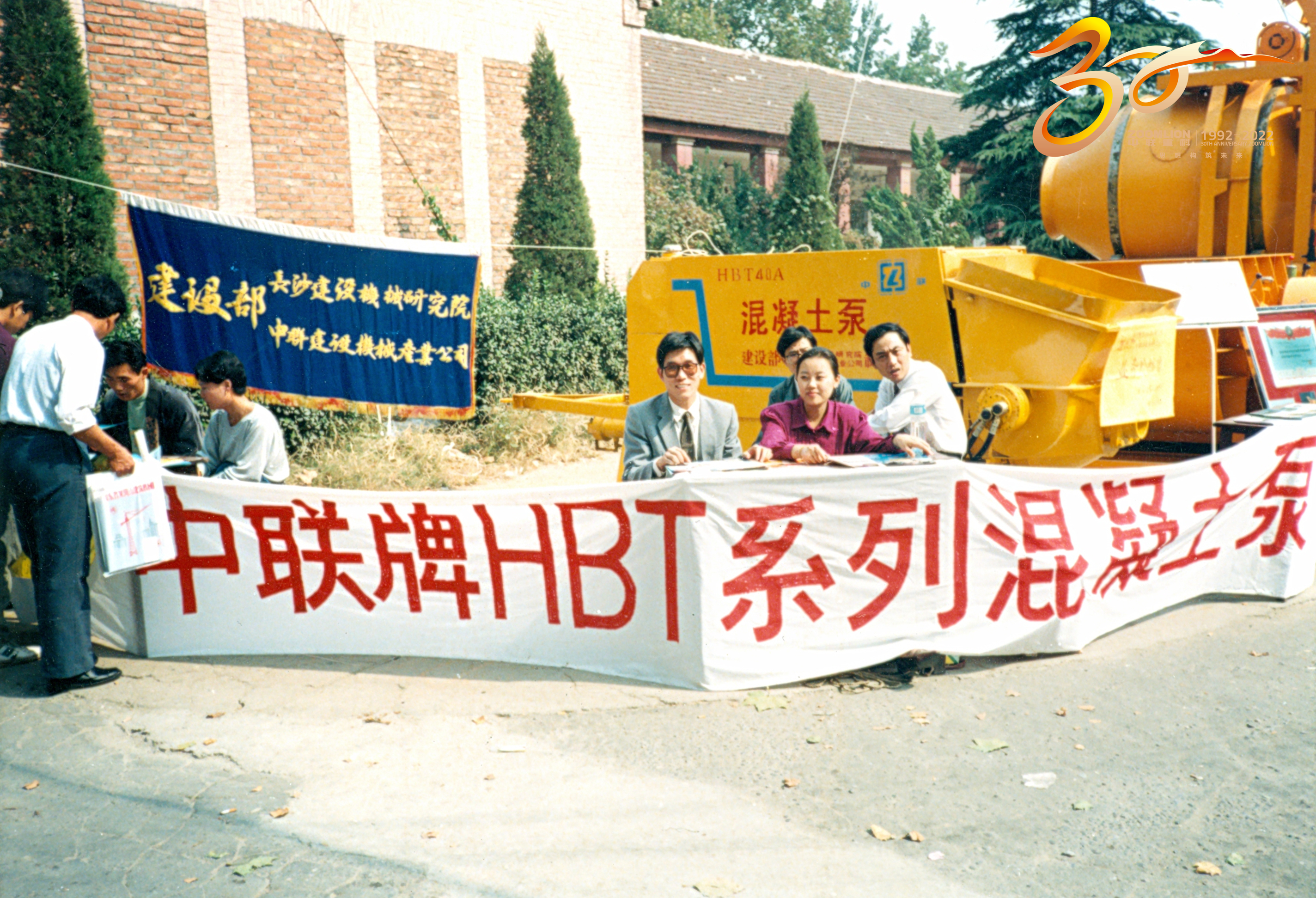 據(jù)親歷者回憶,他們打出了兩條橫幅。上面寫著“建設部、長沙建設機械研究院中聯(lián)建設機械產(chǎn)業(yè)公司”。當時,剛成立不久的中聯(lián)重科在業(yè)內(nèi)知名度不高,于是他們充分利用建設部、長沙建設機械研究院的權威性和知名度,打出這條橫幅來吸引客戶。此外,桌前的這條“中聯(lián)牌HBT系列混凝土泵”橫幅還是手寫上去的。