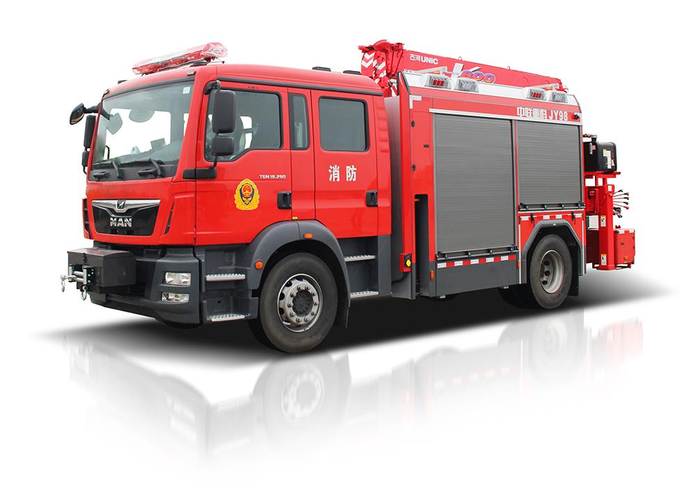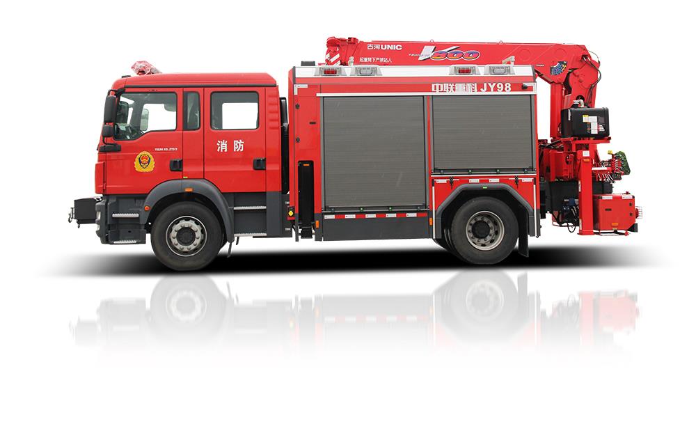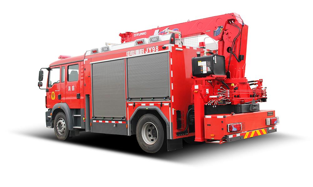 中聯(lián)重科JY98型搶險救援消防車,結(jié)合國內(nèi)外消防車的先進(jìn)理念和消防實(shí)戰(zhàn)創(chuàng)新設(shè)計而成,整車結(jié)構(gòu)緊湊,越障能力強(qiáng),可裝備絞盤、升降照明系統(tǒng)、起吊機(jī)、液壓破拆工具組、偵檢器具、救生器具等超過98件搶險救援器材,是集照明、供電、牽引、起吊、破拆、偵查、救援等功能于一體的多功能消防車,具備強(qiáng)大的搶險功能和綜合救援能力,是火災(zāi)、地震、抗洪、車禍等各類災(zāi)害搶險救援的主力車型。